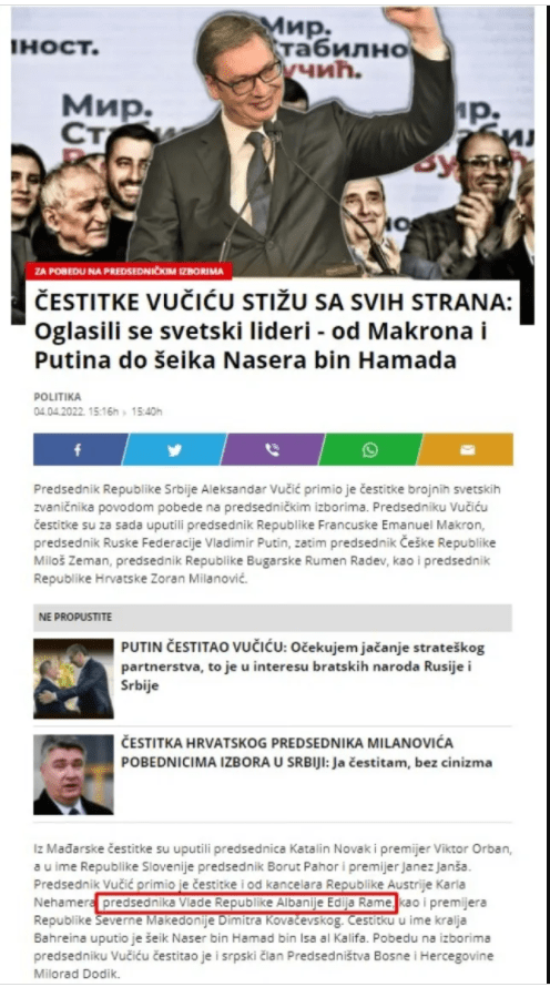 Urime nga Hungaria u dërguan nga presidenti Katalin Novak dhe kryeministri Viktor Orban, dhe në emër të Republikës së Sllovenisë nga presidenti Borut Pahor dhe kryeministri Janez Jansha. Presidenti Vuçiç ka pranuar urime edhe nga kancelari i Republikës së Austrisë, Karl Nehamer, nga kryeministri i Republikës së Shqipërisë, Edi Rama, si dhe nga kryeministri i Republikës së Maqedonisë së Veriut, Dimitar Kovaçevski. Urimet në emër të mbretit të Bahreinit u dërguan nga Sheikh Nasser bin Hamad bin Isa al Khalifa. Edhe anëtari serb i Presidencës së Bosnje-Hercegovinës, Milorad Dodik, ka uruar presidentin Vuçiç dhe fitoren e tij në zgjedhje”.-shkruan Kurir.