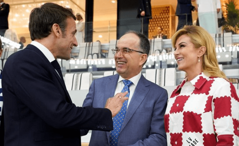 Në pamjet e ndara nga Kitaroviç, shihet se gjatë një takimi kortezie me presidentin Francez Emanuel Macron shfaqet në foto Presidenti i Republikës së Shqipërisë Begaj që qëndron pas tyre.