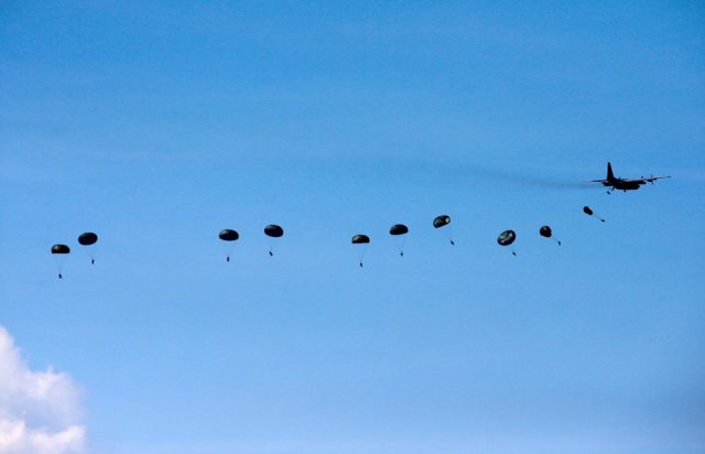 Parashutistët italianë u panë duke u hedhur nga një avion C-130 gjatë stërvitjeve Sëift Response 22 në bazën ushtarake Krivolak në Ballkan.