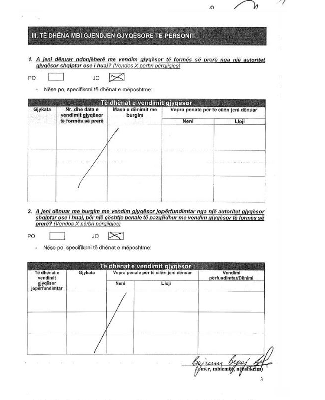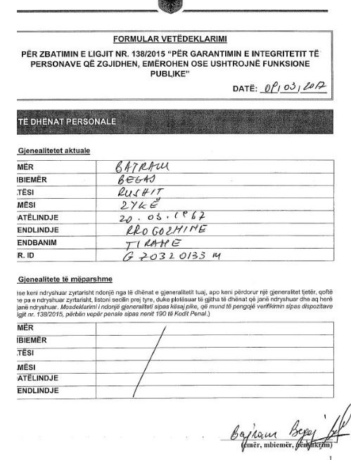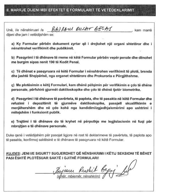 Në formularin e dekriminalizmit, rezulton se Begaj është figurë e pastër dhe nuk ka pasur asnjëherë probleme me ligjin.