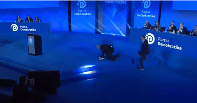 Gjatë momentit që ju dha fjala për të mbajtur fjalimin në Kuvend, Berisha është rrëzuar, duke ngjitur shkallët.