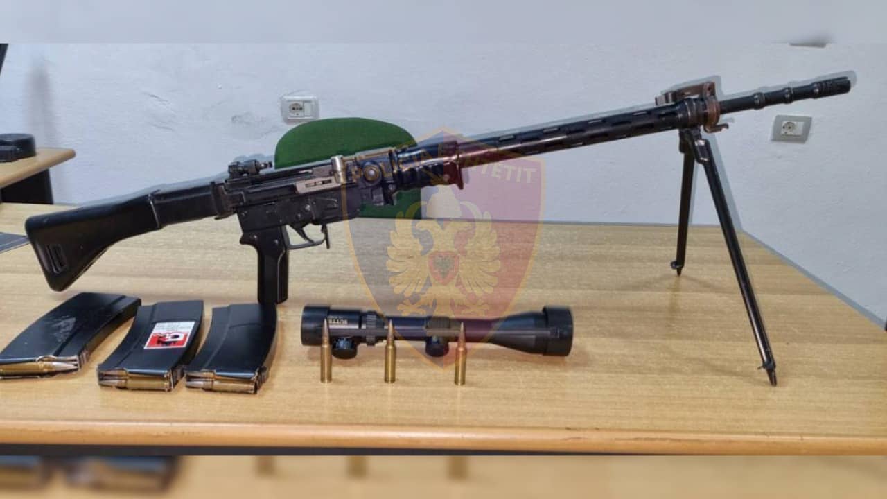 Gjatë kontrollit të ushtruar në banesën e këtij shtetasi, uniformat blu kanë gjetur dhe sekuestruar në cilësinë e provës materiale dhjetëra doza me lëndë narkotike të dyshuar cannabis sativa, një armë zjarri snajper, 64 fishekë dhe një palë dylbi optike.