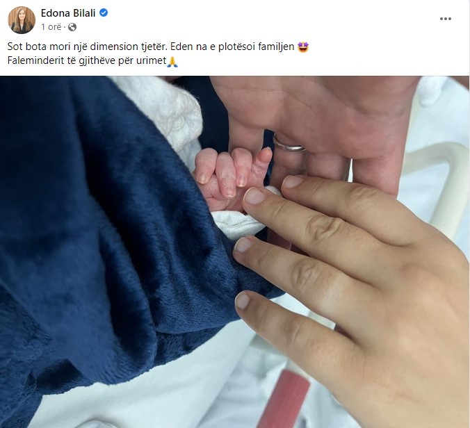 “Sot bota mori një dimension tjetër. Eden na e plotësoi familjen. Faleminderit të gjithëve për urimet”,- ka shkruar ministrja krahas fotos, në të cilën ka marrë urime të shumta nga miqtë dhe ndjekësit e saj.
