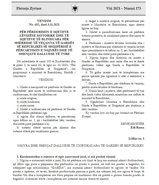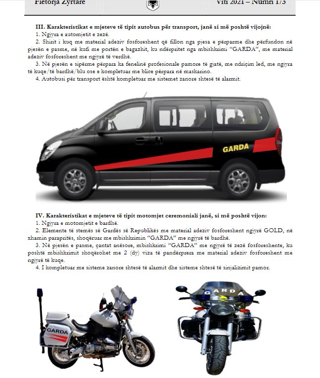 Mjetet e Gardës së Republikës tashmë do të ndryshojnë pamjen dhe do të ‘vishen’ me ‘uniforma’, ndërsa do të ketë disa klasifikime. Mjetet rrugore si automjete, motomjete dhe ato lundruese, të cilat do të dallohen nga ngjyra dhe shenja të tjera.