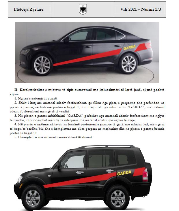 Ngjyra e mjeteve tokësore përveç motomjeteve do jetë e zezë. Në përbërje do ketë një shirit të kuq me material adeziv fosforeshent, ndërsa do të ketë mbishkrimin ‘GARDA’.