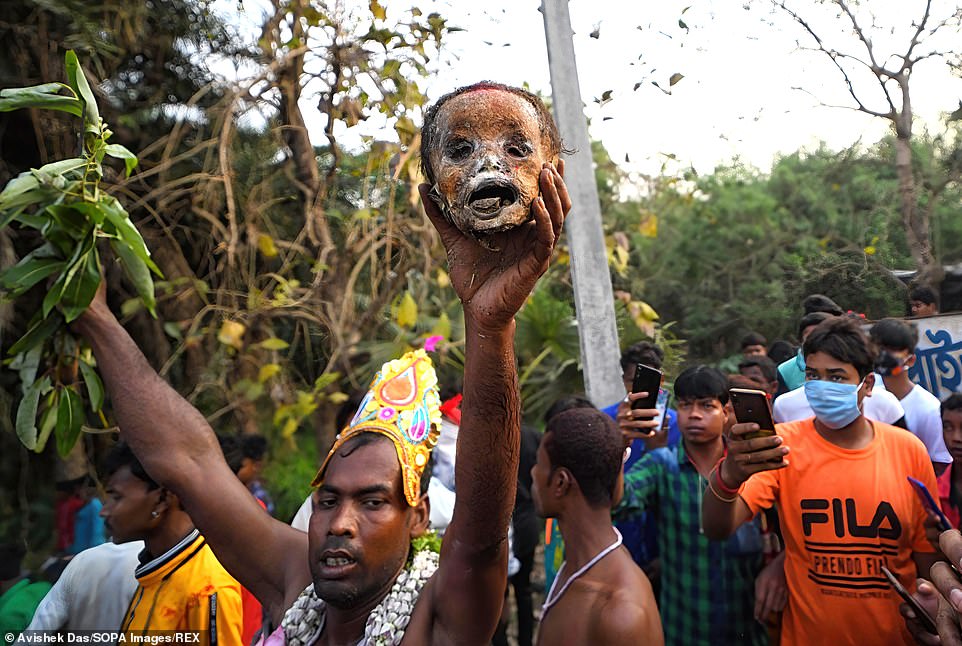 Sipas fotografit Avishek Das, në ditën e fundit të Kalendarit Bengali, në mes të prillit, adhuruesit adhurojnë trupat e pajetë për të kënaqur Lord Shiva për shi dhe korrje më të mirë, një praktikë tradicionale 100-vjeçare.