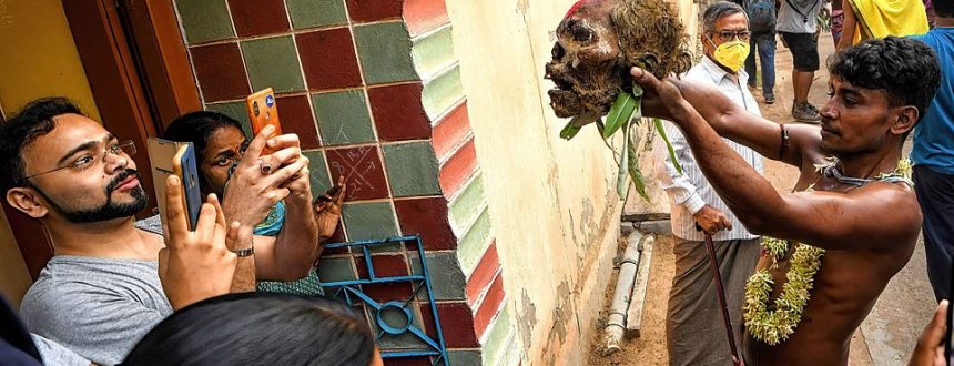 Burimi i lajmit: https://www.dailymail.co.uk/news/article-9465321/Worshippers-dance-human-SKULL-appease-Hindu-deity-India.html