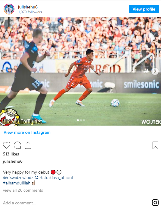 Shehu u fut fill pas golit të dytë të kundërshtarëve, të cilët në atë moment përmbysën gjithçka. Gjithsesi mesfushori është shprehur i lumtur për debutimin, ku shkruan në rrjetet sociale: “Shumë i lumtur për debutimin tim”. Kujtojmë se kontrata e firmosur me polakët është 2-vjeçare.