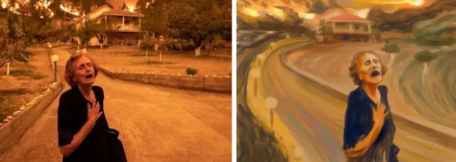 Fotoja e saj ndërsa linte me dhimbje shtëpinë që rrezikohet nga zjarret e pyjeve u bë virale jo vetëm në Greqi, por edhe në botë. Panagiota Noumidi ka treguar për mediat ndjesitë e saj në atë moment kur zjarri me përmasa të frikshme po i afrohej Evia-s.