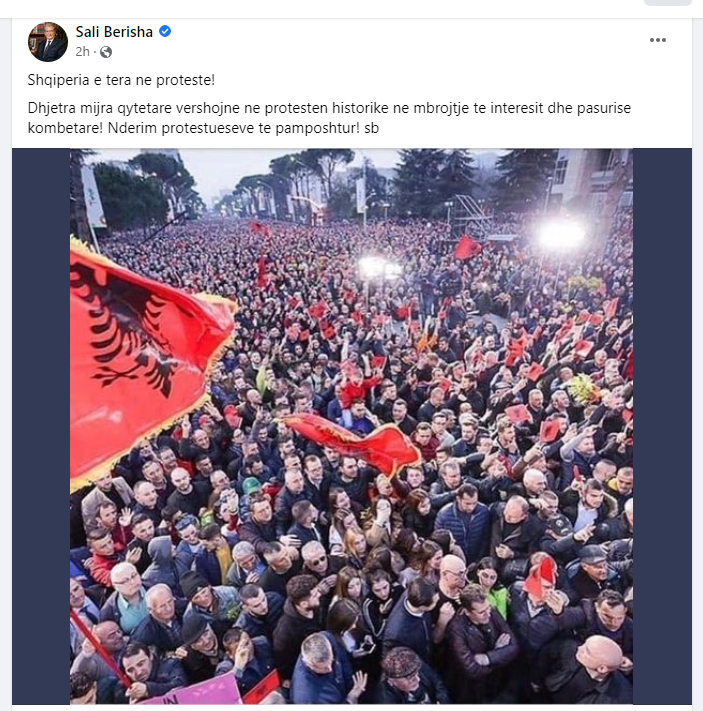 “Shqipëria e tëra në protestë! Dhjetëra mijëra qytetarë vërshojnë në protestën historike në mbrojtje të interesit dhe pasurisë kombëtare! Nderim protestueseve të pamposhtur “, shkruan Berisha.