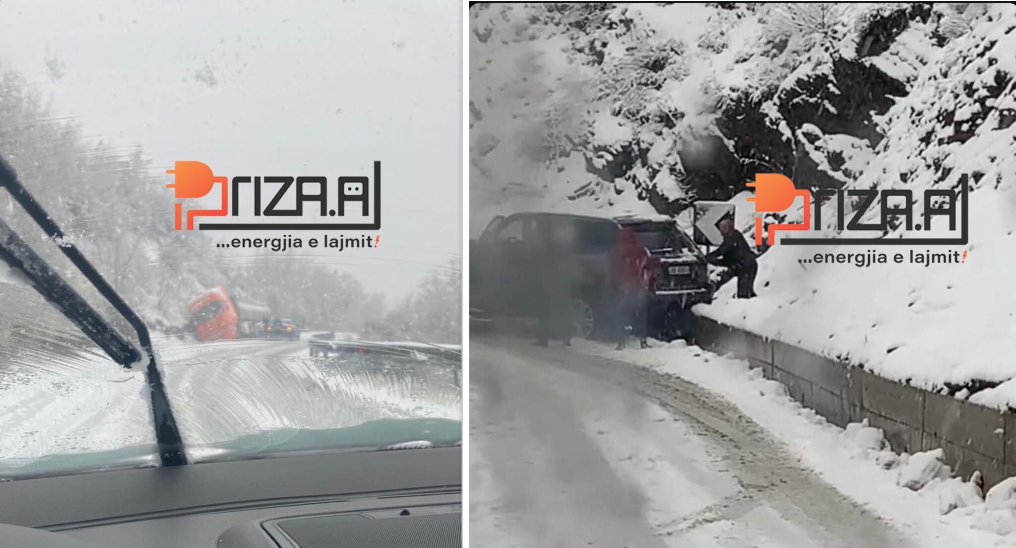 FOTO+VIDEO/ Dëbora shkakton ‘kaos’ në Shqipëri, mjetet rrëshkasin në rrugën e Arbrit! Aksi Pogradec-Korçë i vështirë për tu kaluar