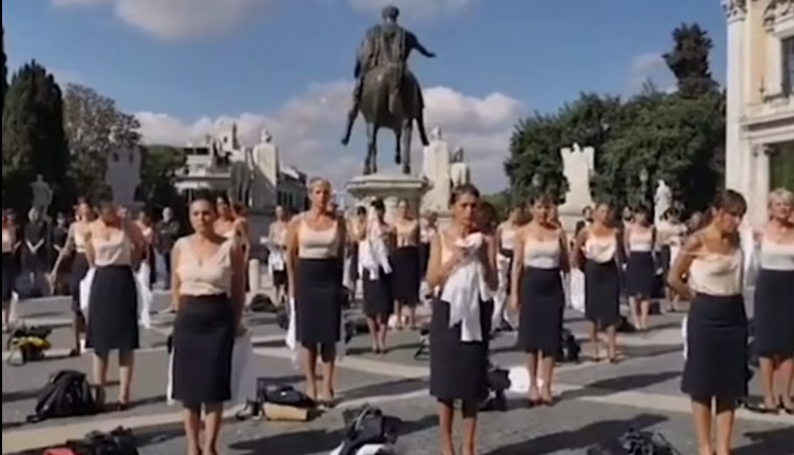 Dhjetëra ish-stjuardesa nga linja ajrore italiane Alitalia e cila u mbyll, hoqën uniformat e tyre në qendër të Romës, dhe qëndruan të veshura vetëm me rroba të brendshme në një protestë të heshtur.
