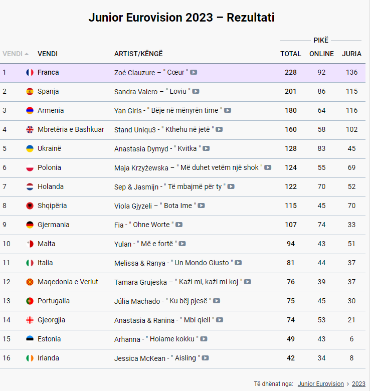 Juritë kombëtare dhe votimi online përcaktuan secila 50% të rezultatit.