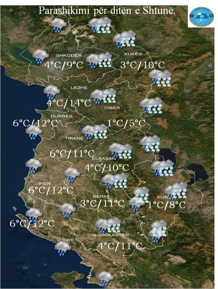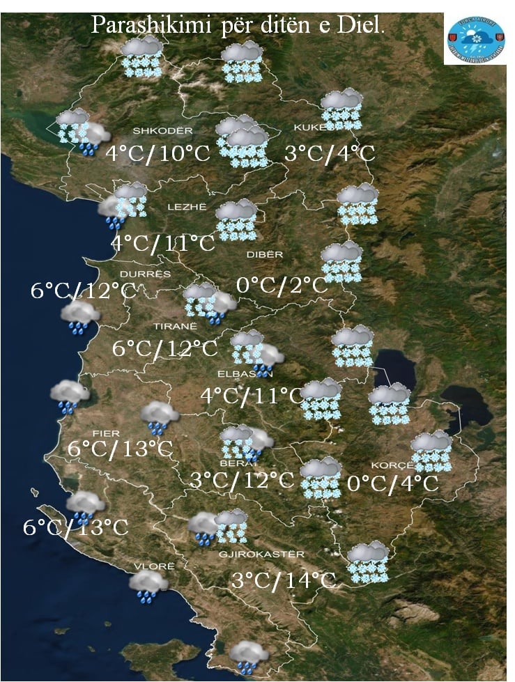 Në relievet malore, reshje të dendura dëbore edhe në formën e stihive të dëborës. E njëjta situatë edhe ditën e diel, pasi moti parashikohet me vranësira të dendura shoqëruar me reshjet e shiut dhe dëborës. Përgjatë vijës bregdetare dhe zonat e ulta, reshje shiu me intensitet mesatar dhe duke filluar nga orët e pasdites deri të lartë në formën e shtrëngatave shoqëruar me shkarkesa elektrike.