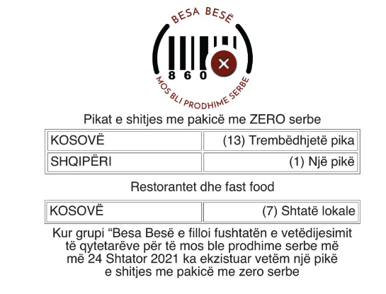 “Janë 13 pika të shitjes me pakicë me zero produkte serbe në Kosovë, ndërsa një pikë në Shqipëri. Po ashtu, janë 7 restorante që nuk e ofrojnë prodhime nga Serbia”.