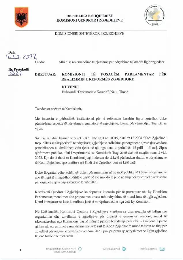 Komisioni Qendror i Zgjedhjeve i ka dërguar një shkresë Kuvendit në lidhje me ndryshimet për kuadrin ligjor zgjedhor.
