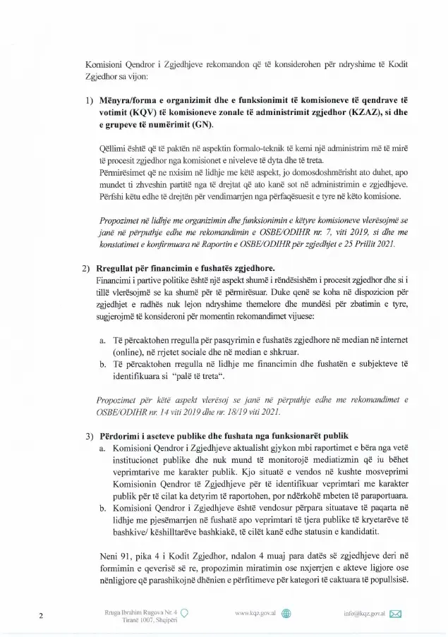 “Të përcaktohen rregulla për pasqyrimin e fushatës zgjedhore në median në internet (online), në rrjetet sociale dhe në median e shkruar. Të përcaktohen rregulla në lidhje me financimin dhe fushatën e subjekteve të identifikuara si palë të treta”, shkruhet ndër të tjera në shkresë.