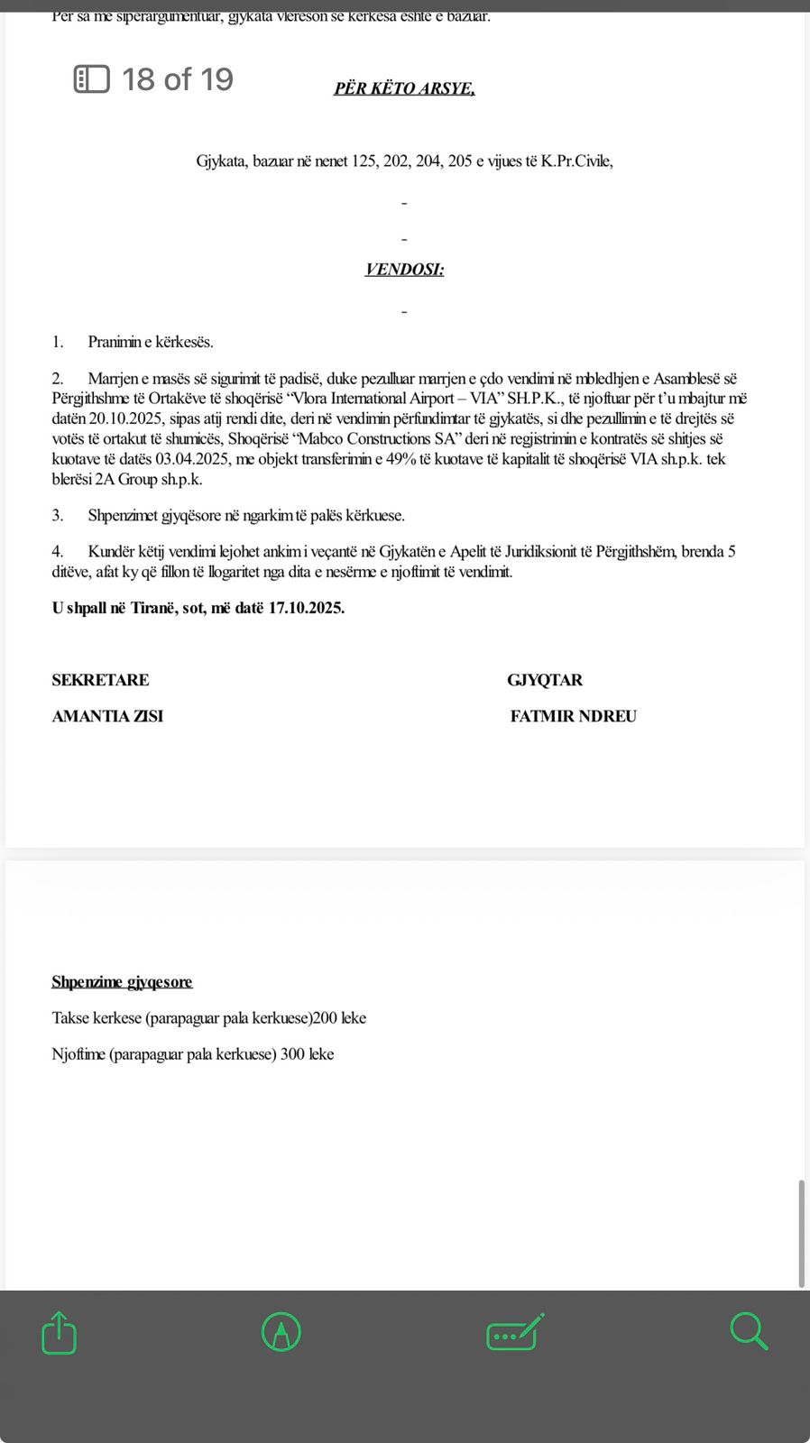 Sipas një vendimi, Gjykata e Tiranës ka pranuar kërkesën e paraqitur dhe ka marrë masën e sigurimit të padisë ndaj Shoqërisë “Vlora International Airport – VIA” SH.P.K., duke pezulluar çdo vendim të planifikuar në Asamblenë e Përgjithshme të Ortakëve, e cila ishte caktuar të mbahej më 20 tetor 2025.