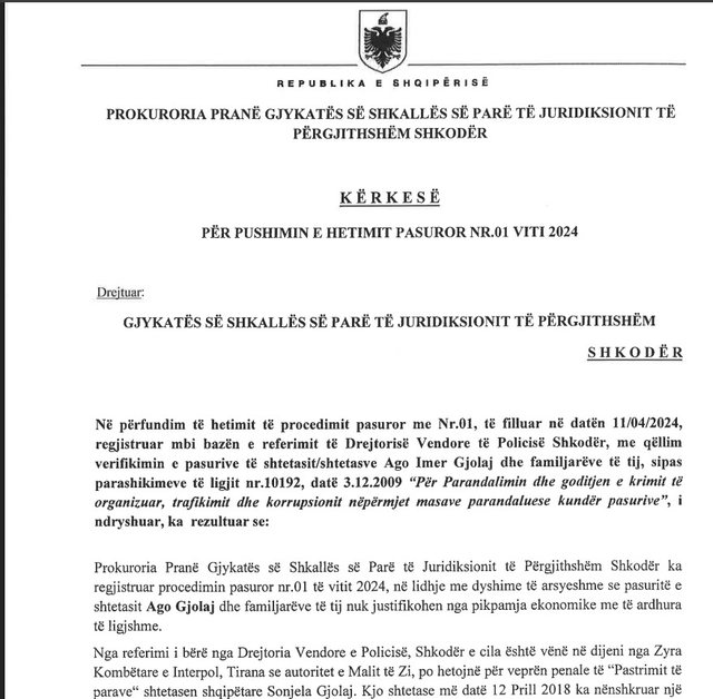 Në fund, i kërkon gjykatës pushimin e hetimeve dhe pasuritë e sekuestruara të cituara më sipër dhe të kthyera më pas subjektit Ago Gjolaj t’i kthehen përfundimisht pronarëve të ligjshëm sipas vendimit të Gjykatës së apelit të juridiksionit të Përgjithshëm, Tiranë.