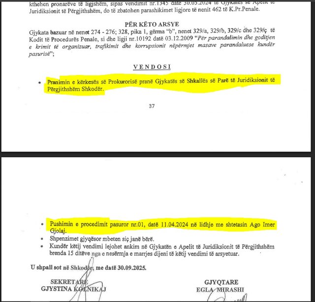 Në fund, gjyqtarja Egla Mirashi vendosi “pushimin e procedimit pasuror me numër 01, datë 1 prill 2024 në lidhje me shtetasin Ago Imer Gjolaj”.