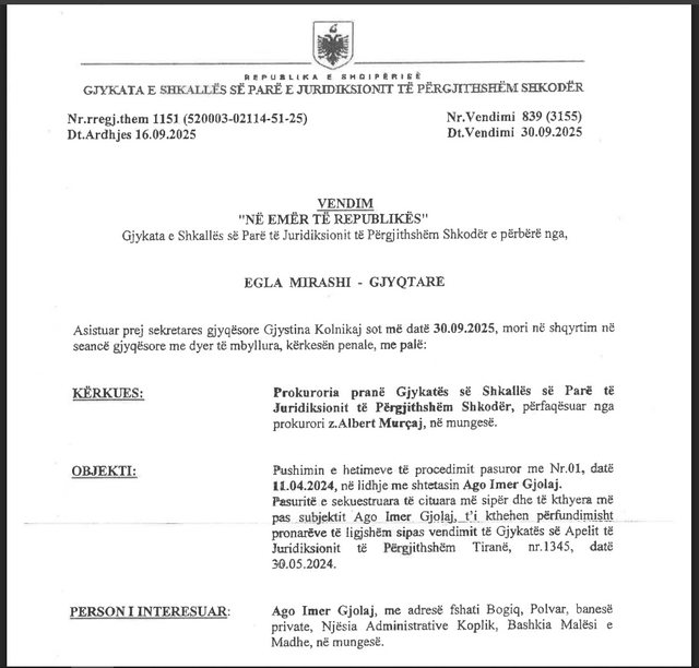 Në datë 30 shtator 2025, Gjykata e Juridiksionit të Përgjithshëm Shkodër vendosi të pranojë kërkesën e prokurorisë së Shkodrës.