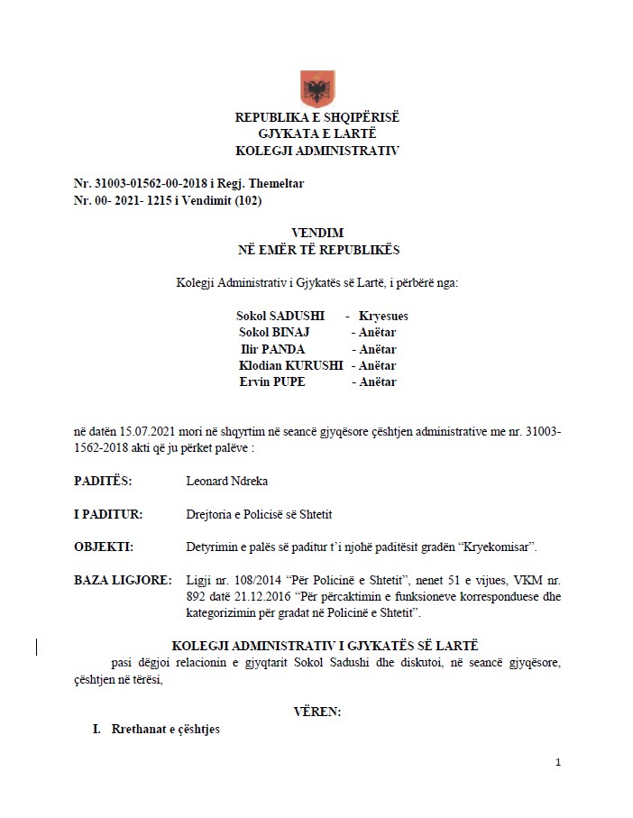 “Gjykata e Lartë vlerëson me rëndësi koherencën në praktikën gjyqësor,si dhe interpretimin e drejtë dhe uniform të ligjit nga ana e të gjitha gjykatave të faktit të Republikës së Shqipërisë. Në vazhdën e publikimit të vendimmarrjes së kolegjeve të Gjykatës së Lartë, në ndihmë zbatuesve të së drejtës dhe opinionit publik, Kolegji Administrativ i kësaj gjykate njofton se në datën 15.07.2021, mori në shqyrtim në seancë gjyqësore çështjen administrative me nr.31003-01562-00-2018 Regjistri Themeltar, e cila shënon vendimin e parë njësues të këtij Kolegji në fushën e të drejtës administrative.