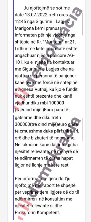 Burime për median bëjnë me dije se hajdutët i kanë grabitur modeles rreth 100 mijë euro para të gatshme dhe rreth 300 mijë euro sende me vlerë(bizhuteri ari dhe ora të çmueshme).