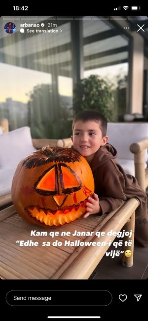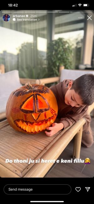 Moderatorja ka ndarë në rrjetin social Instagram një foto, ku zbulon se ka nisur me dekorimin e kungujve, detaji i fundit i Halloween-it. “Do thoni ju si herët e keni filluar”, shkruan moderatorja në foton e parë e cila pasohet nga një tjetër foto e djalit të saj Jonit. “Kam që në janar që dëgjoj: “Edhe sa do Halloween-i të vijë”– shkruan Arbana krahas fotos.