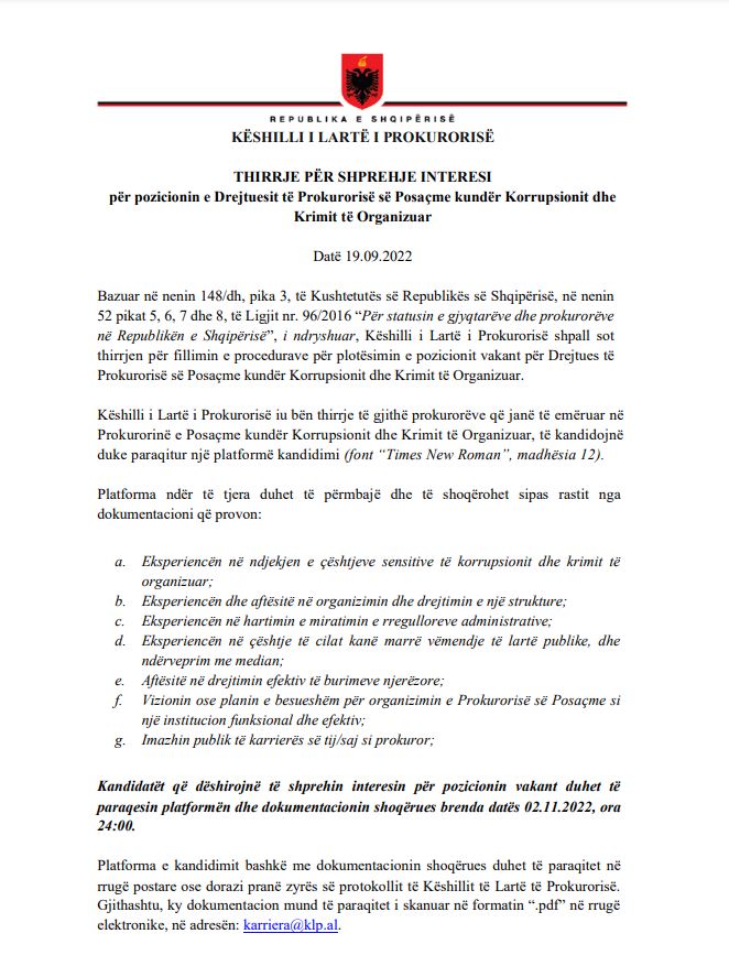 Sipas njoftimit të KLP-së, kandidatët e interesuar duhet të paraqesin dokumentacionin dhe platformën deri më datë 2 nëntor 2022, ora 24:00.
