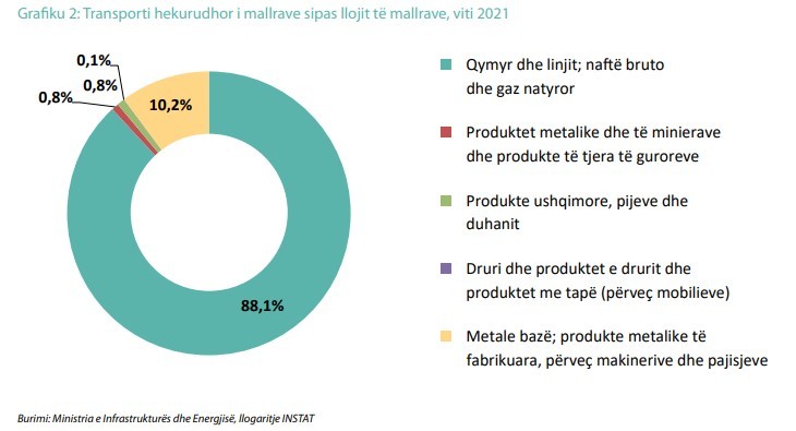 Në 2021, transporti i kryer nga subjektet private zë pjesën më të madhe të transportit hekurudhor të mallrave në vend me 88% në ton dhe 77% në ton-km. Mallrat e transportuar klasifikohen sipas Klasifikimit Standart Evropian (NST 2007), i zbatuar në Shqipëri prej vitit 2019. Sipas klasifikimit NST 2007, 88,1 % e mallrave të transportuar me hekurudhë e zënë qymyri dhe linjiti, nafta bruto dhe gazi natyror si dhe 10,2 % janë produkte metalike dhe të minierave dhe produkte të tjera të guroreve.