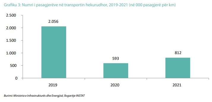 Në vitin 2021, 24.018 pasagjerë kanë përdorur transportin hekurudhor si mjet për udhëtim, ku krahasuar me një vit më parë numri i pasagjerëve që kanë udhëtuar me këtë lloj transporti është rritur me 33,8 %. Në grafikun më poshtë paraqitet numri i pasagjerëve për km, për periudhën kohore 2019-2021./Monitor
