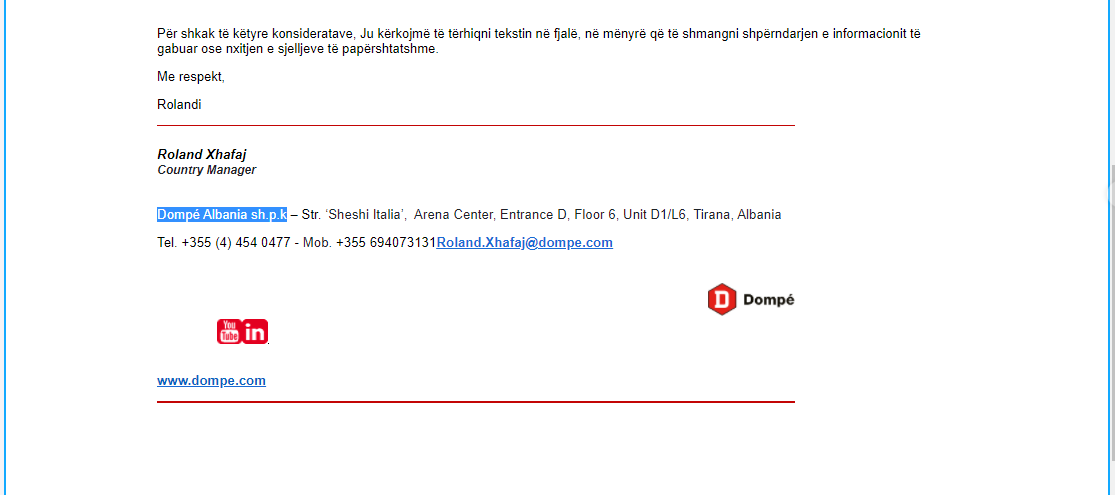 (Foto: Koka e emailit dërguar “Priza.al” nga “Dompé Albania sh.p.k”)