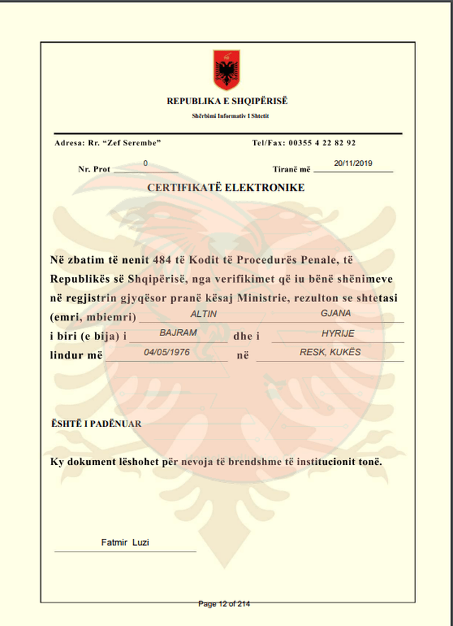 Për të gjithë dokumentet, data është e njëjtë 26-6-2020. Mbi të shkruhet “Në zbatim të nenit 484 të Kodit të Procedurës Penale të Repuvlikës së Shqipërisë, nga verifikimet që iu bënë shënimeve në regjistrin gjyqësor pranë kësaj Ministrie, rezulton se shtetasi…është i padënuar“.