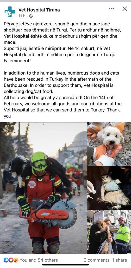 Një ndihmë e veçantë vjen padyshim nga Vet Hospital Tirana, i cili është përkushtuar të ndihmojë kafshët e mbijetuara nga ajo tragjedi.