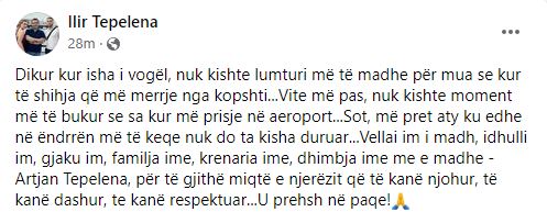 Sot, më pret aty ku edhe në ëndrrën më të keqe nuk do ta kisha duruar…Vellai im i madh, idhulli im, gjaku im, familja ime, krenaria ime, dhimbja ime me e madhe – Artjan Tepelena, për të gjithë miqtë e njerëzit që të kanë njohur, të kanë dashur, te kanë respektuar…U prehsh në paqe!”, shkruan vëllai i gazetarit.