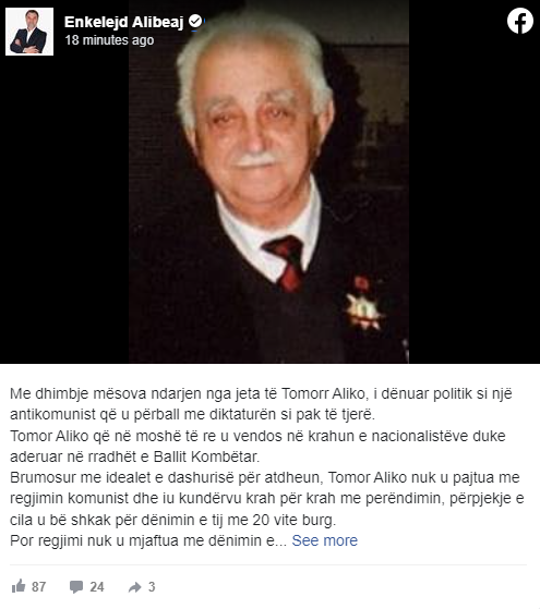 Demokrati Enkelejd Alibeaj ka dhënë lajmin e ndarjes nga jeta të intelektualit dhe të ish- dënuarit politik Tomorr Aliko. “Gjatë viteve të demokracisë ai u shndërrua në një simbol të luftës ndaj diktaturës duke qenë aktiv në media me intervista e dokumentarë, si dhe autor i disa librave që sot janë një provë e madhe për krimet e diktaturës komuniste ndaj shqiptarëve”, shkruan Alibeaj për të ndjerin.
