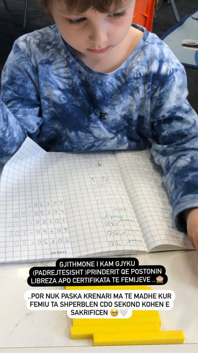 “Gjithmonë i kam gjyku (padrejtësisht) prindërit që postonin libreza apo certifikata të fëmijëve…por nuk paska krenari ma të madhe kur fëmija ta shpërblen çdo sekondë kohën e sakrificën”, ka shkruar këngëtarja krahas fotos së të birit duke bërë detyrat.