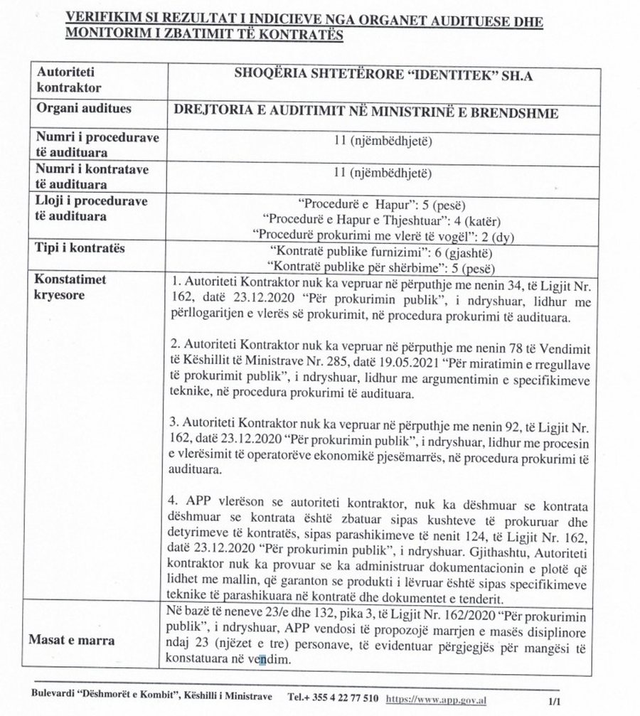 Kompania shtetërore e prodhimit të dokumenteve të identifikimit duket se është shndërruar në një çerdhe e mbushur me hajdutë. Agjencia e Prokurimit Publik ka audituar 11 tendera të zhvilluara nga shoqëria Identitek. Sipas raportit të APP thuajse të gjithë tenderat kanë rezultuar me shkelje flagrante të ligjit.
