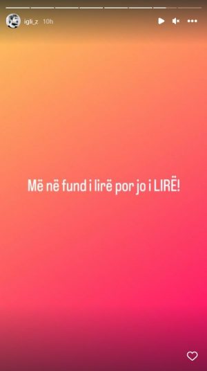 Mirëpo debati nuk është mbyllur këtu. Së fundmi Zarka ka reaguar në Instagramin e tij, ku qartë thumbon hapur Ilir Shaqirin. “Më në fund i lirë, por jo i lirë!”-shkruan Igli në Instastory.