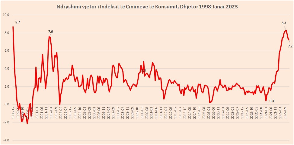 Sipas njoftimit të INSTAT, Ndryshimi vjetor i indeksit të çmimeve të konsumit në muajin Janar 2023 është 7,2%, një vit më parë ky ndryshim ishte 3,7%. Ndryshimi mujor i indeksit të çmimeve të konsumit në muajin Janar 2023, krahasuar me Dhjetor 2022 është 1,1%.