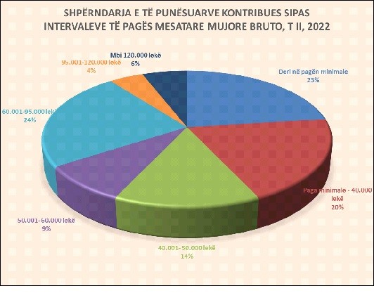 Kategoria e punonjësve me pagë 60,000-70,000 lekë zuri 23.8 për qind të totalit të punonjësve me sigurime nga 23.5 % që ishte në janar-mars 2022. Rritje e lehtë u vu re edhe në grupet me paga të larta 95,000-120,000 dhe mbi 120, 000 lekë.
