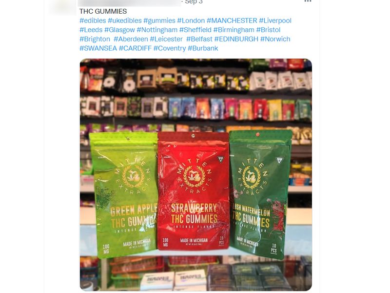 Kërkimi në Telegram për fjalën “gummies” sjell shumë grupe ku ëmbëlsirat mund të blihen për vetëm 5 £. Një grup ka 62,000 abonentë dhe dy të tjerë kanë pothuajse 30,000 dhe 16,000 abonentë secili.