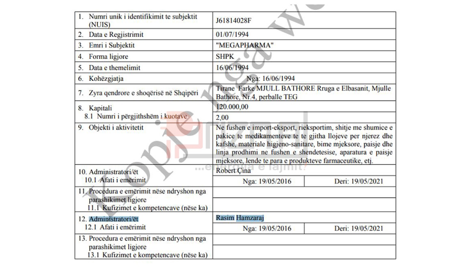 Rasim Hamzaraj është administratori i kompanisë “Megapharma” në Shqipëri, aksionere e së cilës rezulton edhe gruaja e tija Monika Hamzaraj.