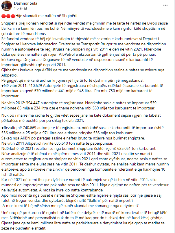 Përmes një postimi në rrjete sociale, Sula bën me dije se megjithëse numri i makinave në përdorim është gati dyfishuar, sasia e karburantit të importuar është ulur.