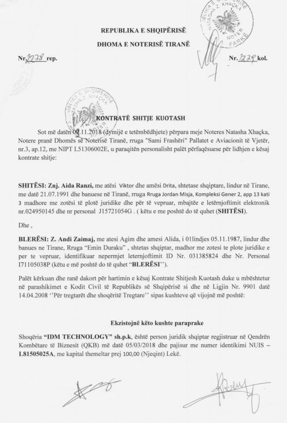 Një vit më pas më 11 qershor 2019 tek e njëjta notere pra tek Natasha Xhaçka paraqitet sërish Andi Zaimaj por këtë herë me dikë tjetër me vete, për t’i shitur 50% e vet në kompaninë “IDM TEÇHNOLOGY shpk” të cilën e kishte blerë një vit më parë nga Aida Ranzi.