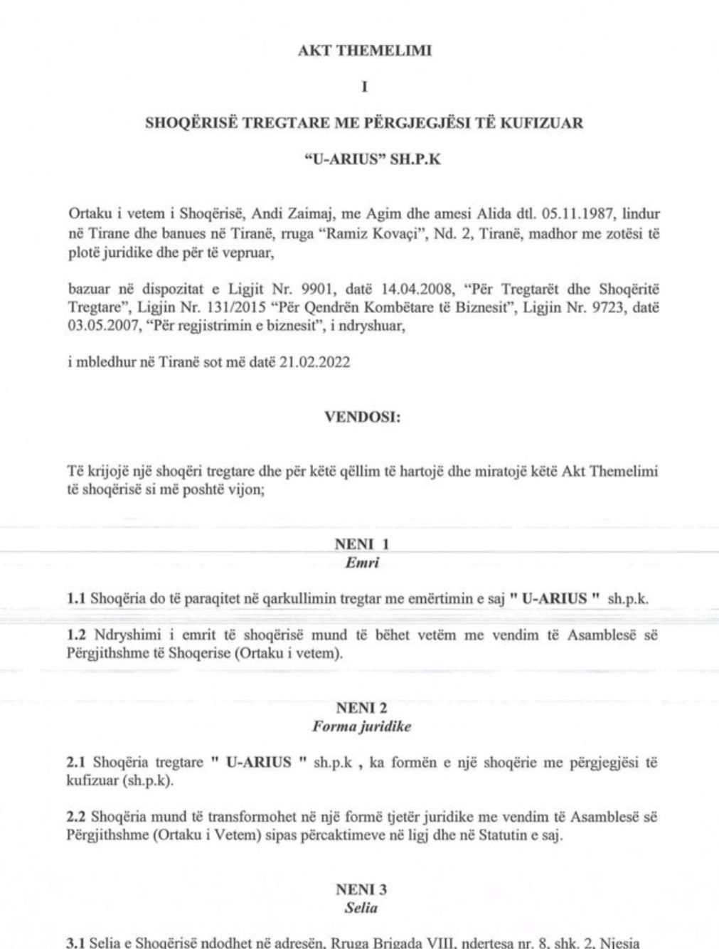 Kështu më datë 22 shkurt 2021 Andi Zaimaj themelon kompaninë “U-ARIUS” shpk. Këtë rradhë Andi Zaimaj kuptoi që një kompani serioze nuk mund të ketë kapital vlerën e dy shisheve të vogla uji, dhe vendosi që kapitali të jetë 100.000 lek ose 1 milionë lek të vjetra.