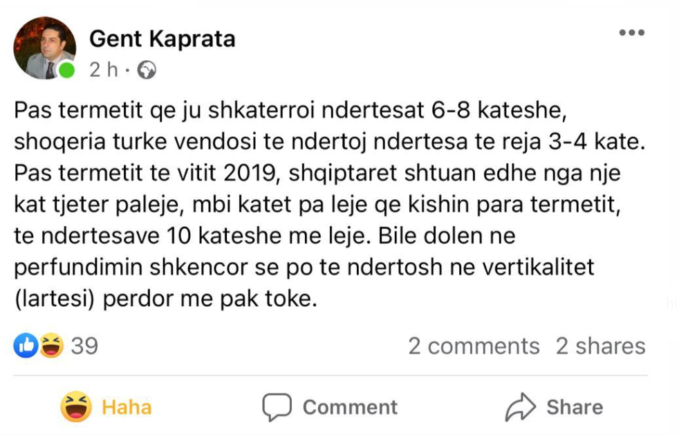 “Pas tërmetit që ju shkatërroi ndërsat 6-8 katëshe, shoqëria turke vendosi të ndërtojë ndërtesa të reja 3-4 katë. Pas tërmetit të vitit 2019, shqiptarët shtuan edhe nga një kat tjetër pa leje, mbi katet pa leje që kishin para tërmetetit të ndërtesave 10 katëshe me leje. Bile dolën në përfundimin shkencor se po të ndërtosh në vertikalet (lartësi) përdor më pak tokë”.