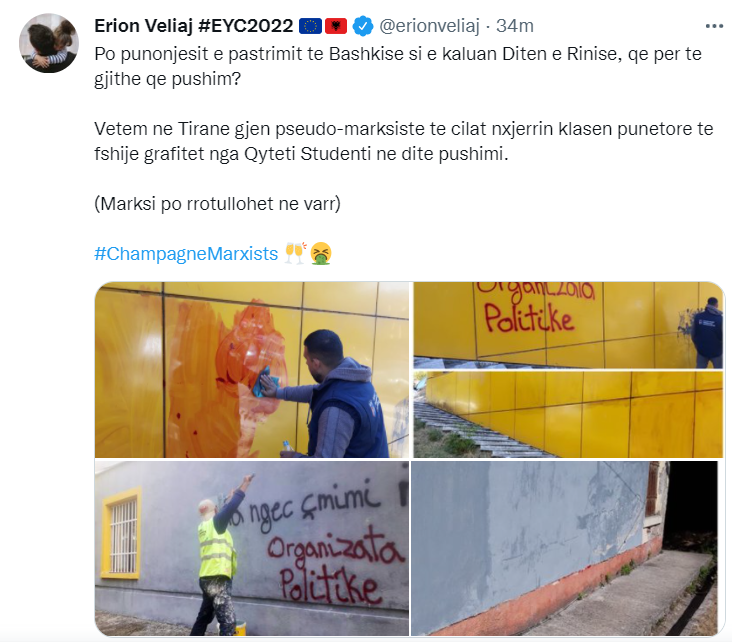 “Po punonjësit e pastrimit të Bashkisë si e kaluan Ditën e Rinise, që për të gjithë qe pushim? Vetëm në Tiranë gjen pseudo-marksiste të cilat nxjerrin klasën punëtore të fshijë grafitet nga Qyteti Studenti në ditë pushimi. (Marksi po rrotullohet në varr)”, shkruan Veliaj.