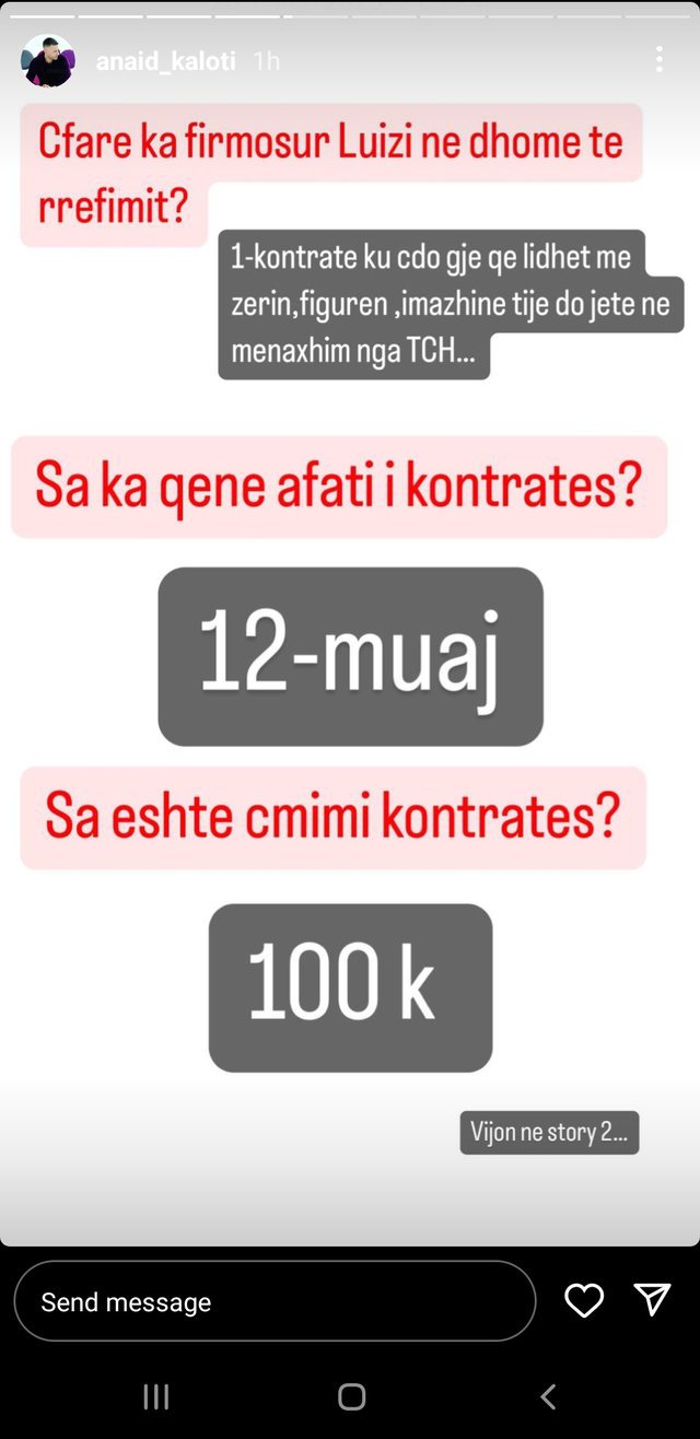 Ndërkohë, pas kësaj ish-fituesi i “Big Brother 6”, Anaid Kaloti, ka deklaruar në mediat sociale se nga kontrata me Top Channel, Luizi ka marrë 100 mijë euro.