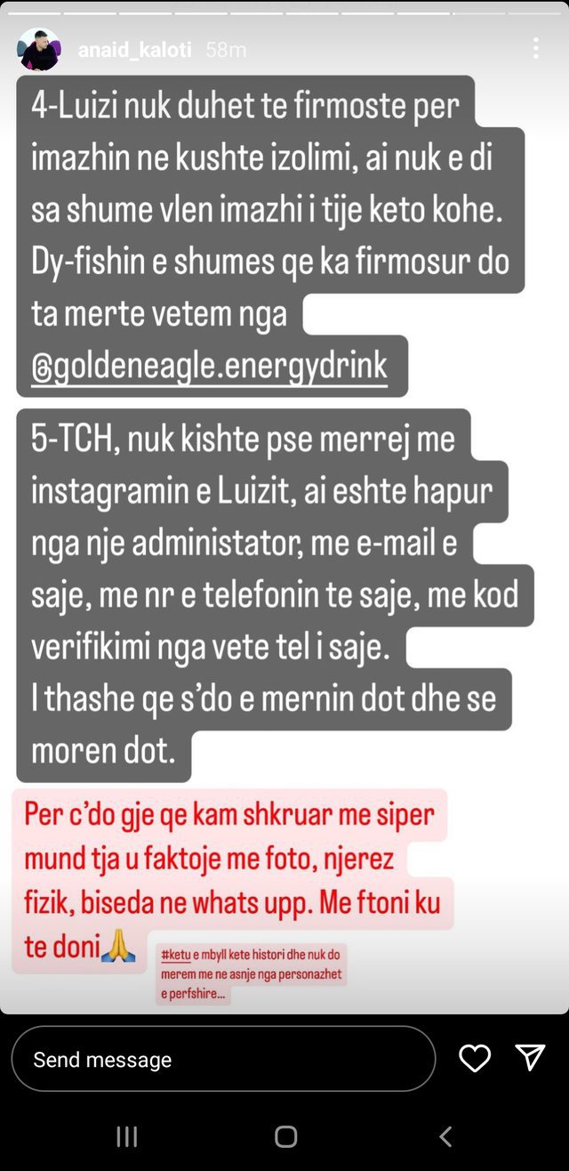 Ai shkruante se kjo është arsyeja pse janë bllokuar fotot dhe informacionet nga Instagrami zyrtar i Luizit, duke shtuar se nuk i është komunikuar se në çfarë forme dhe akti juridik është kryer kjo.